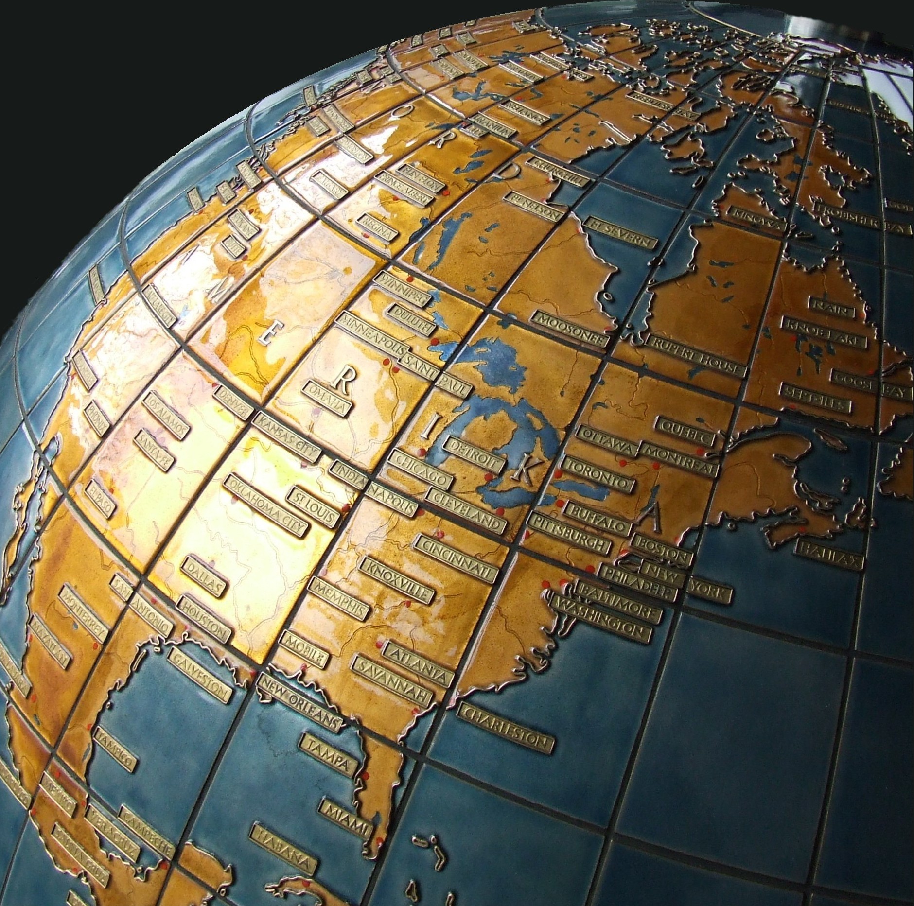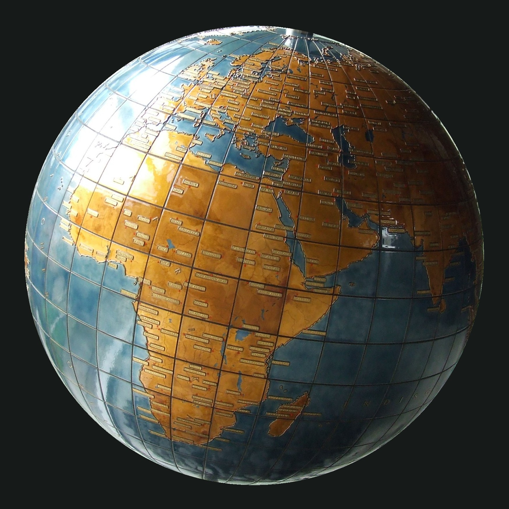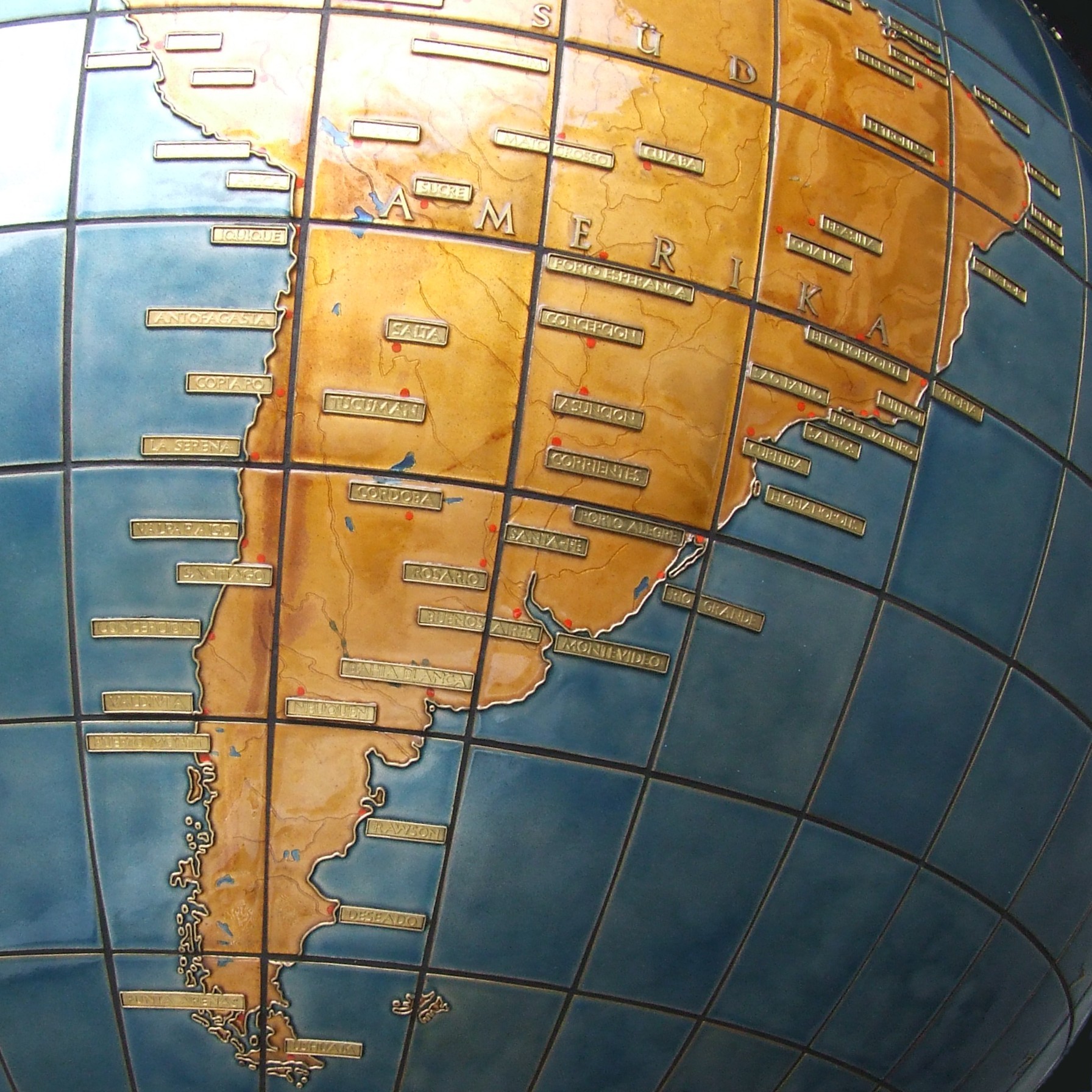 In contrast to a lamp or jewellery brazier a corpus brazier manufactures jars and appliances of brass and copper. Again and again, the craftsman preferred basic geometrical forms in shaping his conical cups, spherical jugs, pyramid-shaped bottles, cube-shaped boxes or cylindrical candlesticks. The object which took most pains, i. e. about 10,000 hours of work, is the globe which was created between 1968 and 1988. It is an attractive globe sculpture made in a fascinating crosspiece enamel technique. This sculpture was created out of self-interest and was meant for a big hall. Maybe, it was the outcry of an Eastern German, who in that time could make a trip around the world only with his fingers on the globe? The officially recognised artist-craftsman was honoured twice for his unique globe, in Sevilla 1992 and in Hanover 2000. Those, who want to get this brilliant marble into their house, will need a door that is 1.28 metres wide. For displaying it in the open air a protective roof is recommended. |